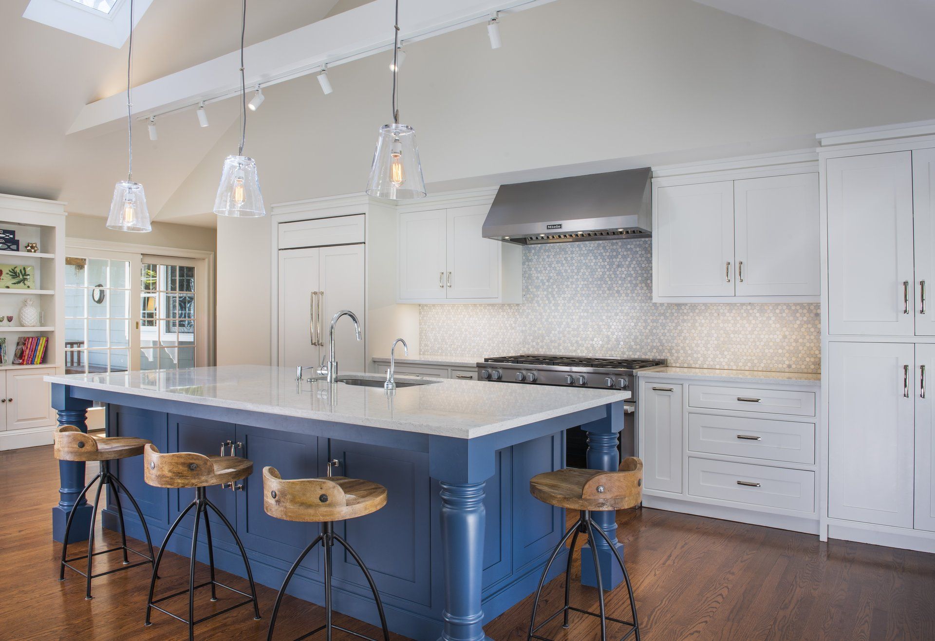 This is one customer who was not afraid to introduce color. Blue island and a compliment Round Kitchen backsplash with Glass, Blue Celeste and Thassos.