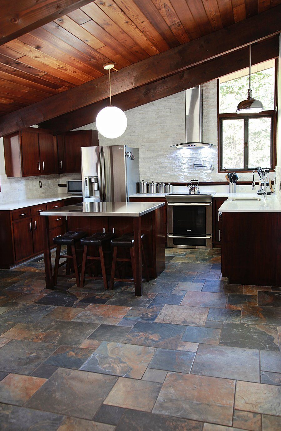 Multiple step patterns kitcen floor done with Unicom Natural Slate Multicolor and a white ledge stone backsplash
